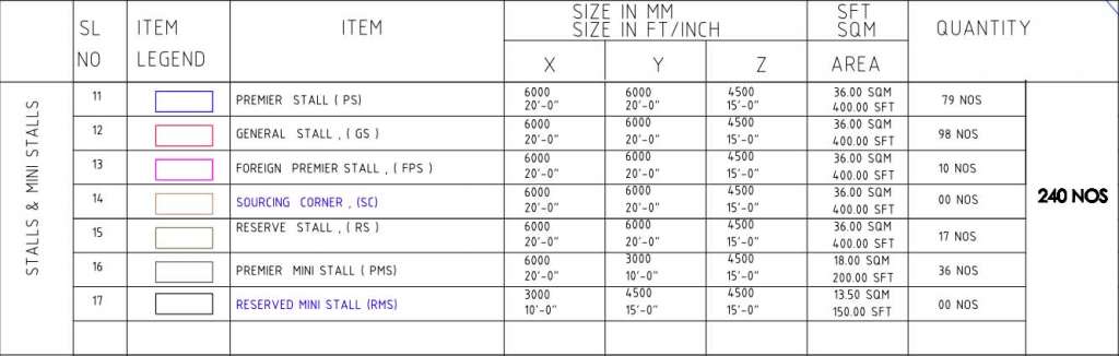 The Stalls and Mini Stalls category is designed for small to medium exhibitors looking for flexible and accessible display spaces. It comprises Premier, General, Foreign Premier, and Reserved Stalls, each with an area of 400 square feet, alongside Premier Mini Stalls of 200 square feet. With a large number of units available, this category supports a diverse range of businesses, startups, and product-focused exhibitors catering to both B2B and B2C audiences.